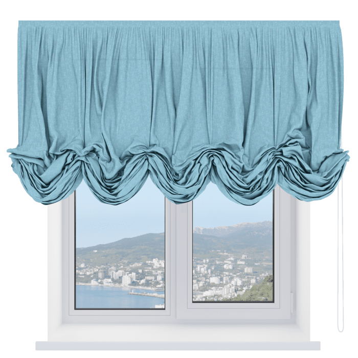 Австрийская штора лён кашемир голубой, карниз верёвочный